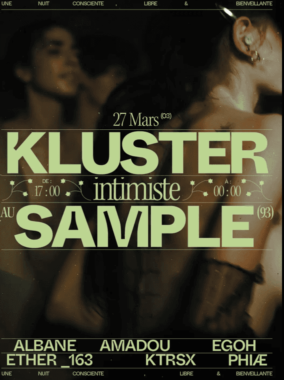 Kluster revient le vendredi 27 mars pour une dernière soirée au Sample. Cette date sera l’occasion de se retrouver une dernière fois dans ce lieu emblématique de la scène alternative parisienne, qui a accompagné et nourri le développement du collectif. Pour cette soirée en intimité, la line up sera composée à 100 % d’artistes du collectif, qui nous plongeront dans leurs univers variés, fidèles à l'identité de Kluster, entre techno hypnotique, groove et plus encore. Un format fin de journée, de 17h à 00h, pour ouvrir le week-end en douceur et partager un dernier moment ensemble au Sample.